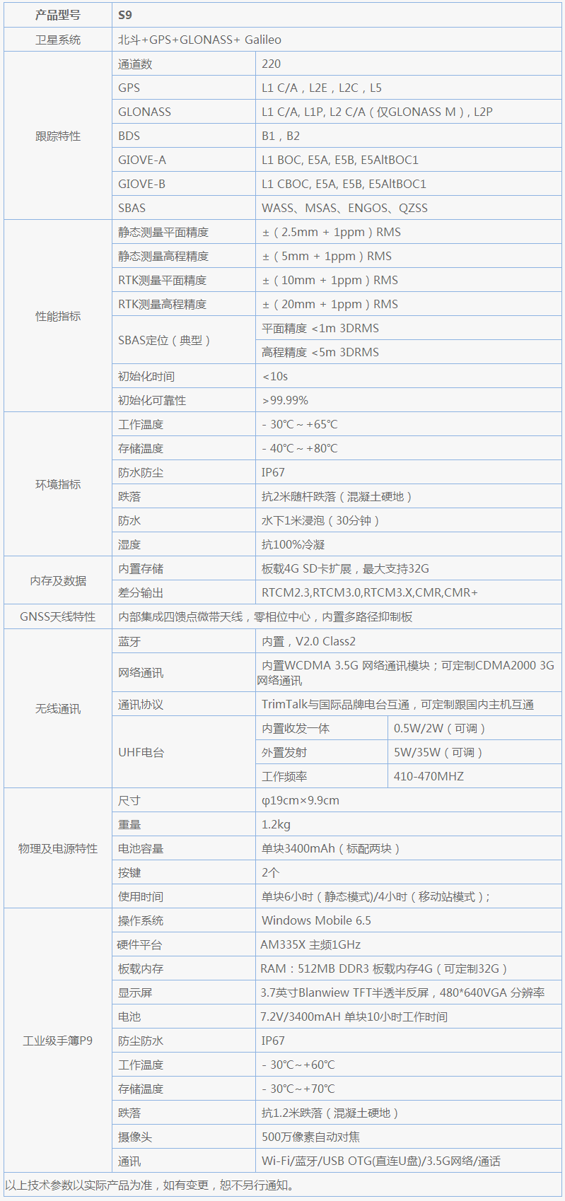 S9配備工業(yè)級采集手簿P9。全新設(shè)計(jì)的P9,較上一代產(chǎn)品運(yùn)行效率提高30倍以上。全鍵盤、IP67防護(hù)等級;CORTEX A8處理器主頻1GHz;DDR3內(nèi)存;3.7英寸Blanview二代顯示屏,480×640分辨率;內(nèi)置500萬像素?cái)z像頭;單塊3400mAh智能電池支持10小時作業(yè)。內(nèi)置U-blox8多星GNSS芯片(采集型)。