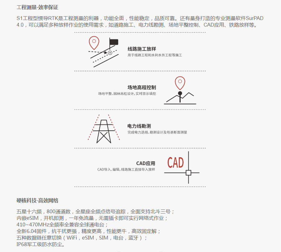 產(chǎn)品描述:S1 ?程型慣導(dǎo)RTK,搭載基于“天琴”?代芯片的全尺寸高精度定位板卡,全星座全頻點信號追蹤(五星?六頻),全面支持北斗三號;內(nèi)嵌eSIM,開機即測,一年免流量,無需插卡即可實行網(wǎng)絡(luò)式作業(yè);預(yù)裝思拓力第四代慣導(dǎo)傾斜測量技術(shù)(需單獨開通),顯著提升?程放樣效率。