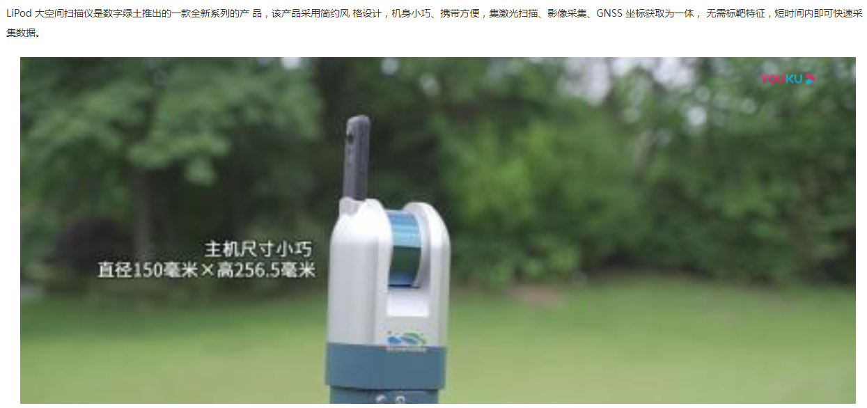 產(chǎn)品描述:LiPod 大空間掃描儀是數(shù)字綠土推出的一款全新系列的產(chǎn) 品,該產(chǎn)品采用簡(jiǎn)約風(fēng) 格設(shè)計(jì),機(jī)身小巧、攜帶方便,集激光掃描、影像采集、GNSS 坐標(biāo)獲取為一體, 無(wú)需標(biāo)靶特征,短時(shí)間內(nèi)即可快速采集數(shù)據(jù)。